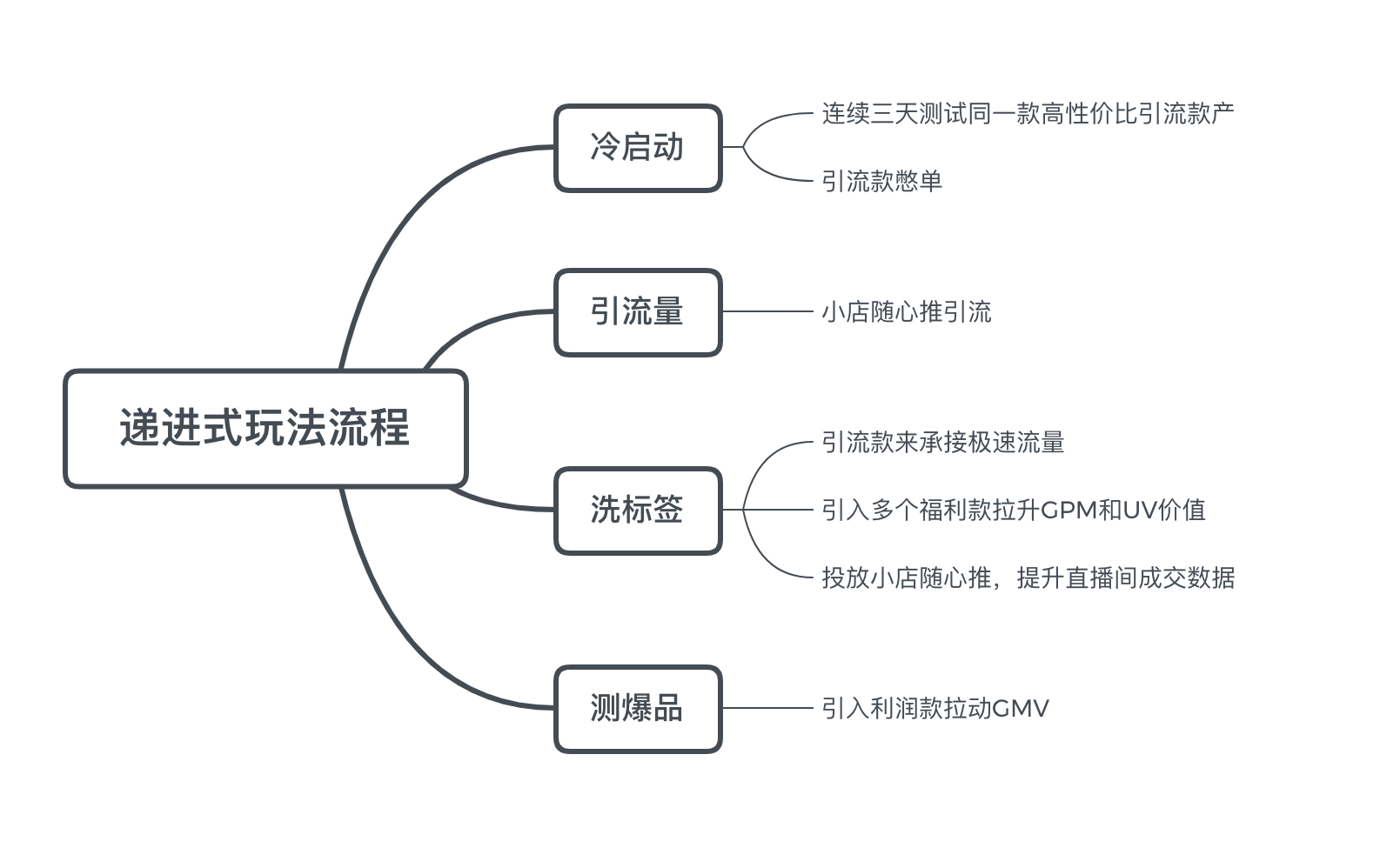 值得注意的是,遞進式玩法對主播的要求比較高,為此,這一切流程都需要建立在主播及話術都過關的前提下。因此,品牌主玩轉(zhuǎn)遞進式玩法需要從冷啟動、引流量、洗標簽、測爆品四個環(huán)節(jié)循序漸進推進。