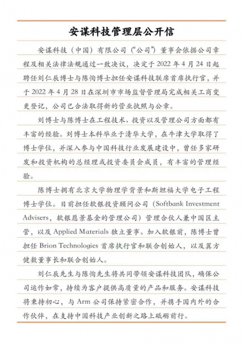 在信中,安謀科技首先感謝了客戶和合作伙伴一直以來對安謀科技的支持,表明公司董事會也已經(jīng)根據(jù)公司章程及相關(guān)法律對安謀科技的治理問題進(jìn)行了妥善且合法的解決。安謀科技在信中提到,公司新任聯(lián)席首席執(zhí)行官劉仁辰博士和陳恂博士已開始全面接手經(jīng)營和領(lǐng)導(dǎo)安謀科技各項業(yè)務(wù)的開展,并得到了員工的大力支持。
