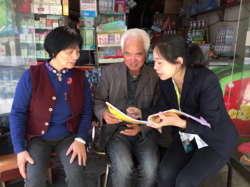 圖為謝根紅(右一)向農(nóng)村老年客戶講解最新的貨源信息和營(yíng)銷策略。