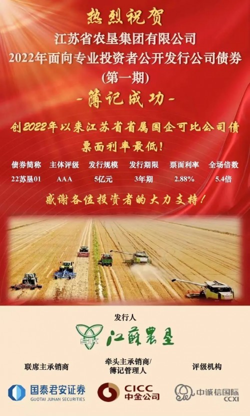 5月25日,由國(guó)泰君安承銷的“江蘇農(nóng)墾集團(tuán)有限公司2022年面向?qū)I(yè)投資者公開發(fā)行公司債券(第一期)”在上海證券交易所成功發(fā)行。本期債券發(fā)行規(guī)模為5億元,期限為3年期,票面利率為2.88%,創(chuàng)2022年以來江蘇省屬國(guó)企可比公司債最低票面利率,成為國(guó)泰君安近期支持“三農(nóng)”、服務(wù)實(shí)體與產(chǎn)業(yè)客戶的又一經(jīng)典案例。