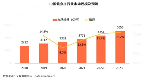 根據艾媒咨詢數據,近幾年,中國健身行業(yè)的市場規(guī)模不斷增長,2021年市場規(guī)模達到3771億元,預計2023年市場規(guī)模將突破5000億元。