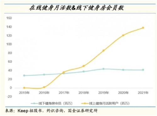 隨著居民運動健身意識不斷增強,加上疫情對傳統(tǒng)健身房的經營造成了較大影響,健身線上化趨勢愈加明顯。數據顯示,2021線下健身房會員為4100萬,而線上健身會員為1.38億。線上健身具有使用靈活、門檻低等特點,受到越來越多人的喜愛,預計未來線上與線下健身人數的差距將進一步拉大。