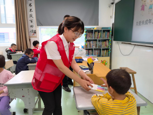 圖為:志愿者為大東壩小學(xué)學(xué)生送上心愿文具