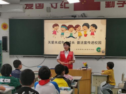 圖為:志愿者開展保護(hù)未成年人免受煙侵害主題課