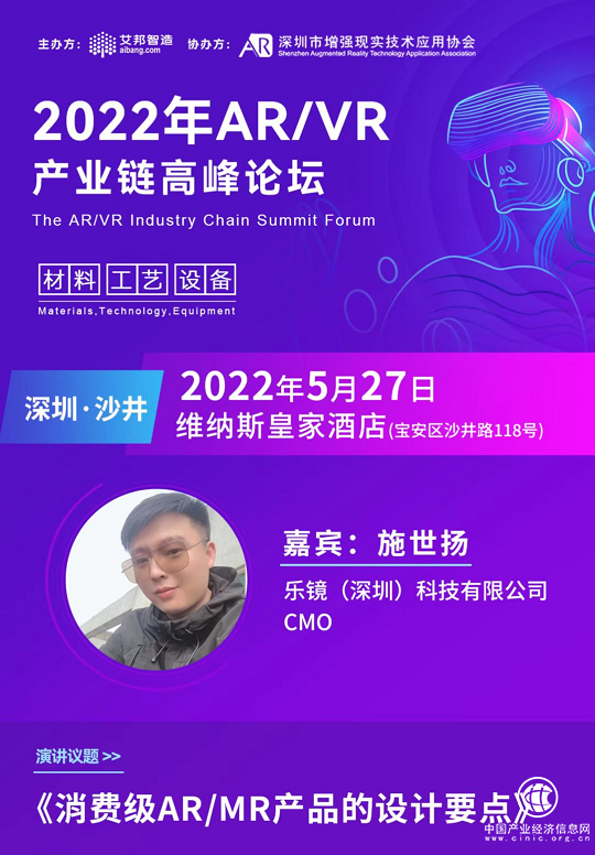 5月27日,2022年AR/VR產(chǎn)業(yè)鏈高峰論壇在深圳沙井維納斯皇家酒店隆重舉辦,本次論壇旨在加強產(chǎn)業(yè)鏈上下游的對接和交流,匯聚了AR/VR產(chǎn)業(yè)鏈品牌終端、ODM/OEM、加工、原材料、設備等相關(guān)企業(yè)代表,樂鏡(深圳)科技有限公司施世揚受邀出席本次活動,并作為行業(yè)代表發(fā)表了《消費級AR/MR產(chǎn)品的設計要點》演講議題。