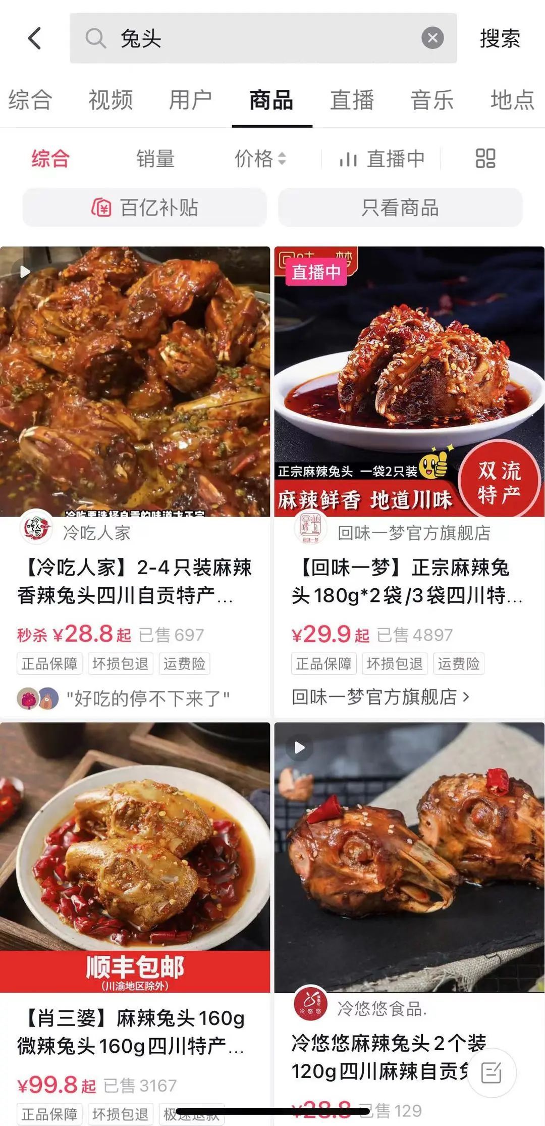 據(jù)說四川人每年會吃掉2億多個兔頭,這一數(shù)字依舊在高速增加。這不僅與上千家川菜館子的菜單相關,更與線上渠道的零食產(chǎn)品帶來的動力相關。如果在抖音搜索與“兔”相關的商品,你就會發(fā)現(xiàn)從自貢冷吃兔,到川味麻辣兔,再到五香兔頭、兔丁、烤全兔。銷量以千計的鏈接不勝枚舉。