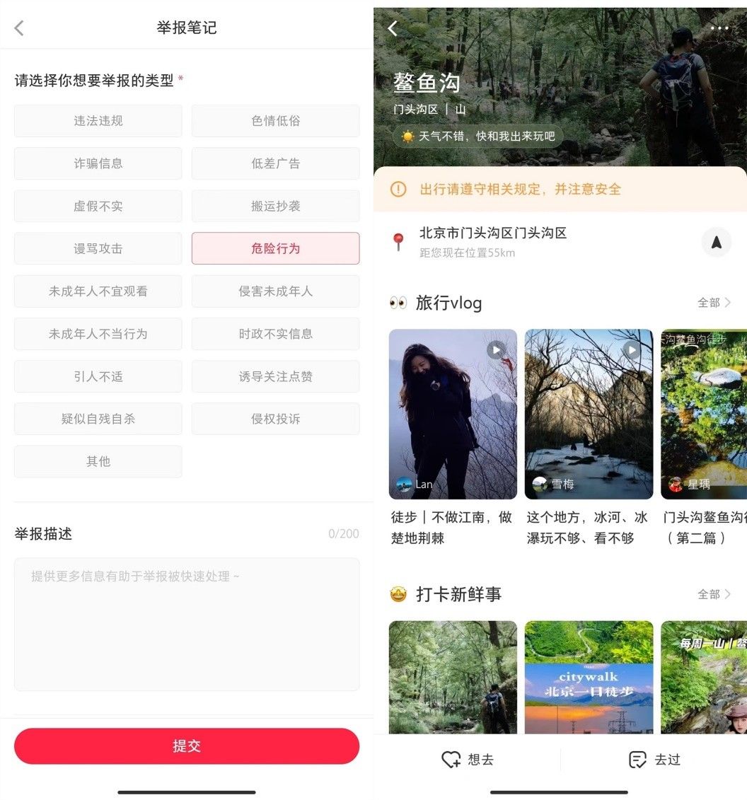 針對(duì)這一現(xiàn)象,小紅書專項(xiàng)治理團(tuán)隊(duì)建立風(fēng)險(xiǎn)內(nèi)容分級(jí)管控機(jī)制,根據(jù)媒體報(bào)道、用戶舉報(bào)等篩選出明確禁止進(jìn)入的目的地,對(duì)相關(guān)內(nèi)容進(jìn)行了回查清理,并上線專項(xiàng)審核策略。團(tuán)隊(duì)同時(shí)研發(fā)上線“風(fēng)險(xiǎn)POI貼條提示”,對(duì)存在風(fēng)險(xiǎn)的目的地主動(dòng)貼條提示。