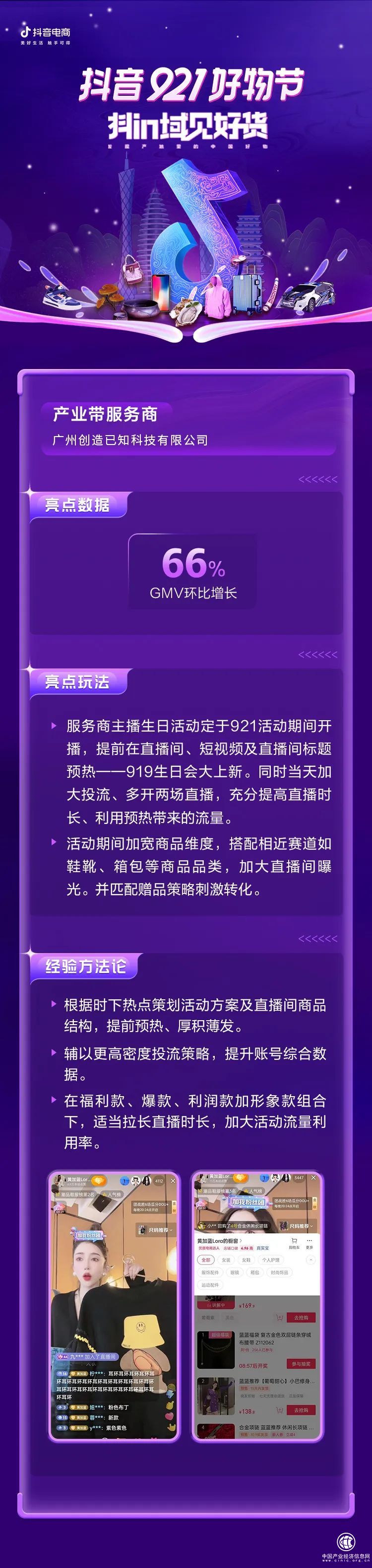 在大促氛圍基礎(chǔ)上,服務(wù)商也能結(jié)合節(jié)點(diǎn),帶動生意“節(jié)節(jié)攀升”。比如,服務(wù)商「廣州創(chuàng)造已知科技有限公司」,便帶領(lǐng)廣東潮流女裝產(chǎn)業(yè)帶商家走上了生意巔峰。借助主播生日會大上新與好物節(jié)熱度,通過投放、貨品、預(yù)熱等多項(xiàng)動作優(yōu)化,廣東潮流女裝產(chǎn)業(yè)帶商家GMV環(huán)比增長66%。