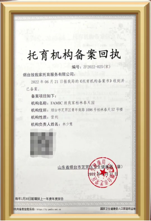 2022年6月21日,煙臺(tái)市芝罘區(qū)衛(wèi)健局為FAMIC放我家頒發(fā)了家庭托育點(diǎn)備案回執(zhí),這是山東省乃至全國(guó)首張家庭托育備案的“牌照”,該備案回執(zhí),說(shuō)明家庭托育可以備案了,可以領(lǐng)“證”了!