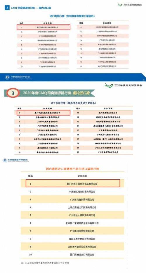 圖:燕之屋2019-2021連續(xù)三年位列《CAIQ國內(nèi)燕窩進(jìn)口商燕窩產(chǎn)品年進(jìn)口量排行榜》榜首
