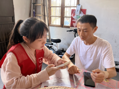 圖為“香溢”志愿者劉美燕向?qū)W生家長(zhǎng)了解助學(xué)對(duì)象家庭情況。(葉蘇蘇 攝)