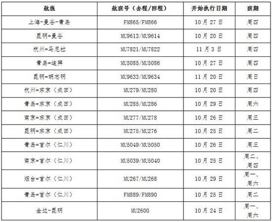 此次新增的國際航線將于10月20日起逐步開始執(zhí)行,其中昆明—曼谷、杭州—東京成田航線20日起恢復,每周1班;金邊—昆明航線24日起增至每周2班,昆明—東京成田、南京—首爾仁川、青島—首爾仁川航線25日起恢復;南京—東京成田、青島—首爾仁川航線26日增至每周1班;上海—曼谷—青島、青島—迪拜航線27日增至每周1班;青島—東京成田、煙臺—首爾仁川航線29日起執(zhí)行。進入11月,東航還將陸續(xù)恢復和加密杭州—馬尼拉、昆明—胡志明等國際航線。具體航班計劃以東航官網(wǎng)實際查詢?yōu)闇省?/p>
