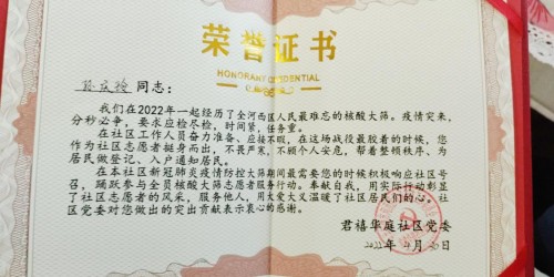 圖:燕之屋天津市場操盤手孫慶玲收到君禧華庭社區(qū)黨委的榮譽(yù)證書