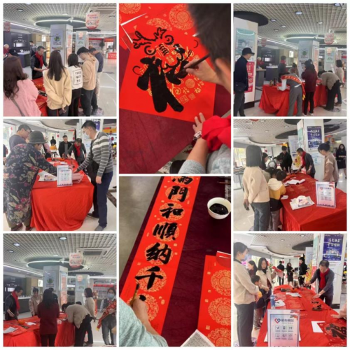 活動(dòng)當(dāng)天邀請(qǐng)了營(yíng)業(yè)廳周邊社區(qū)的老年人及戶外勞動(dòng)者等人群參與,現(xiàn)場(chǎng)呈現(xiàn)出一派歡樂(lè)祥和的氛圍,書法家將美好的祝福融入筆墨之中,結(jié)合生肖龍的形象書寫創(chuàng)意福字及一幅幅年味十足、寄托新春祝福的春聯(lián)。書法家行云流水般書寫春聯(lián)的精湛技藝,吸引了眾多參與者的駐足觀賞,感受中國(guó)書法的魅力。
