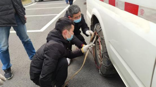 圖為安全員為配送車輛加裝防滑鏈