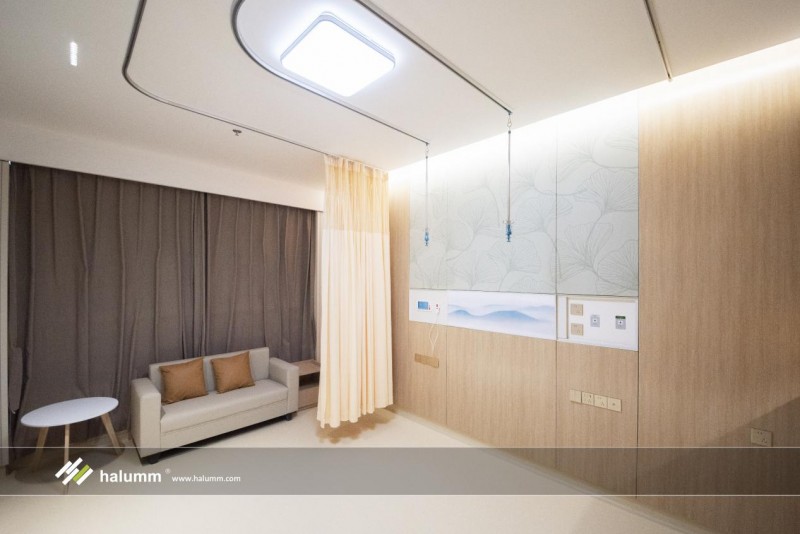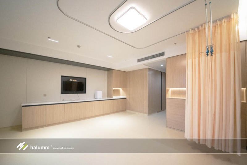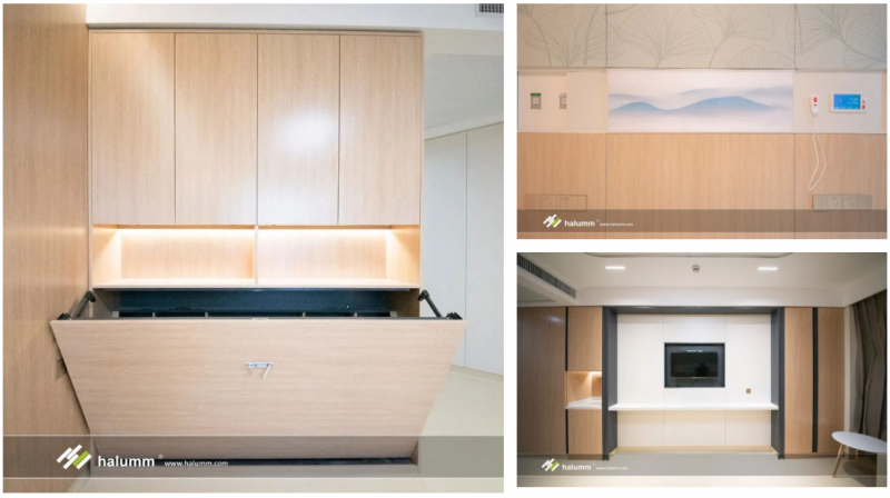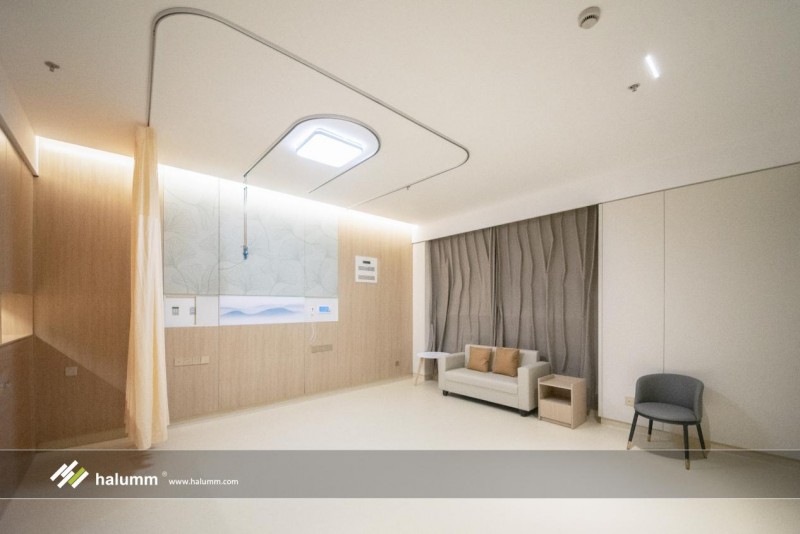 在VIP病房內(nèi),采用漢爾姆自主創(chuàng)新的“可拆裝式輕鋼骨架內(nèi)隔墻成套核心集成技術(shù)體系”,高效整合管線、醫(yī)療設(shè)備等系統(tǒng)和產(chǎn)品,實(shí)現(xiàn)墻體與管線裝修一體化,與墻面齊平,不積灰、易清潔。同時(shí)可重復(fù)拆裝的室內(nèi)非承重隔墻還具備出色的延展性,實(shí)現(xiàn)隱藏式墻體陪護(hù)床無縫切換,吊柜、臺盆柜、收納柜等多種墻柜一體的百變家具場景,以及電視等電子設(shè)備的一體化安裝,為患者及其家屬創(chuàng)造了一個(gè)美觀、整潔、舒適的就醫(yī)環(huán)境。
