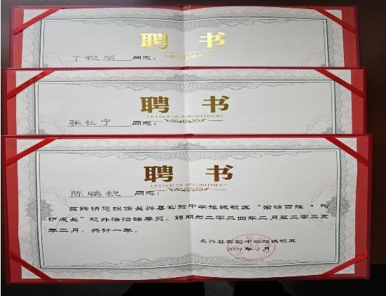 圖為長(zhǎng)興縣煙草專賣局三位志愿者被聘為“校外法治輔導(dǎo)員”