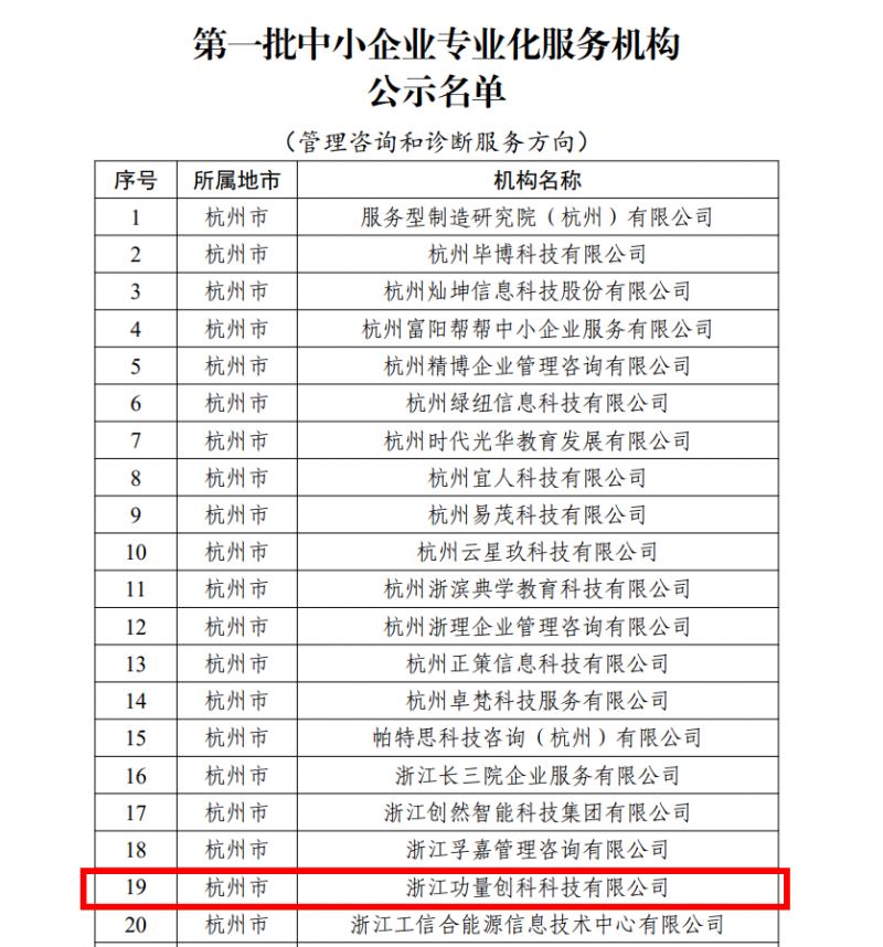 根據《浙江省經濟和信息化廳關于開展第一批中小企業(yè)專業(yè)化服務機構征集遴選工作的通知》,經機構自主申報、省級初審、地市經信部門審核、省級復審、專家評審,2024年1月31日,浙江省經濟和信息化廳公示了第一批中小企業(yè)專業(yè)化服務機構名單,浙江功量創(chuàng)科科技有限公司通過層層審核以及專家評審,成功入選浙江省第一批中小企業(yè)專業(yè)化服務機構。