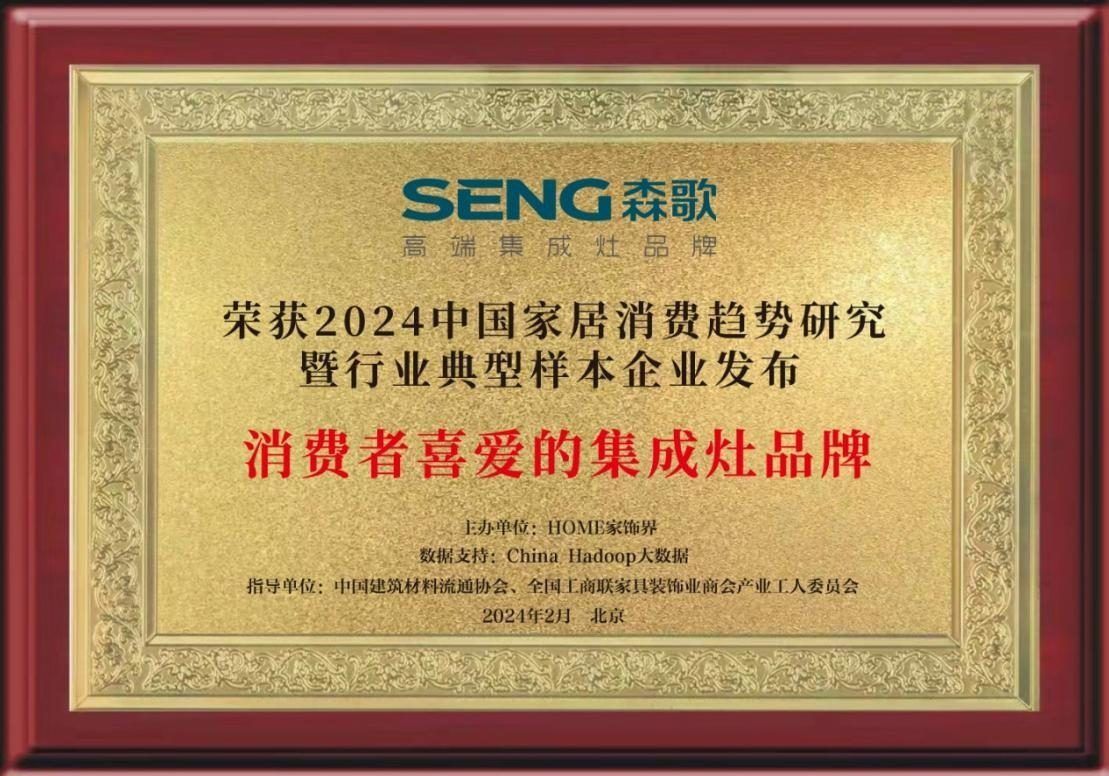 2月29日,由中國建筑材料流通協(xié)會、全國工商聯(lián)家具裝飾業(yè)商會產(chǎn)業(yè)工人委員會、China Hadoop大數(shù)據(jù)、HOME家飾界聯(lián)合發(fā)布“2024中國家居消費趨勢研究暨行業(yè)典型樣本企業(yè)”研究成果,森歌集成灶以杰出的行業(yè)影響力成功入選“中國家居消費趨勢研究廚電行業(yè)典型樣本企業(yè)”,并榮獲“消費者喜愛的集成灶品牌”榮譽。不僅是對森歌冠軍品牌的有力證明,更是對森歌冠軍實力和創(chuàng)新能力的充分肯定。