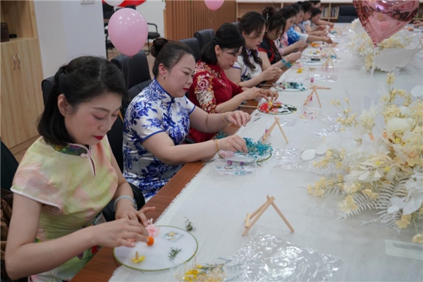 活動(dòng)中,大家學(xué)習(xí)了旗袍的穿著禮儀、中國(guó)傳統(tǒng)的扇文化及干花團(tuán)扇制作技巧。聞著淡淡花香,伴著柔美的音樂(lè),女職工們完成了各具特色的團(tuán)扇作品,大家紛紛拿著作品互相欣賞與贊美,擺造型拍照,用鏡頭記錄下這一切的美好。