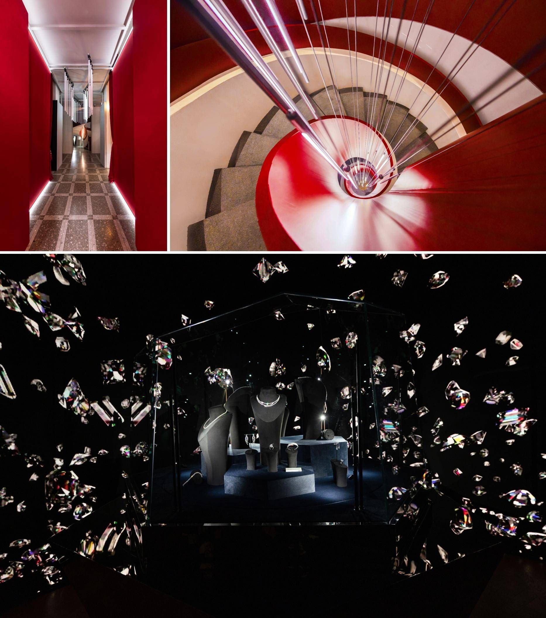 本次展覽的整體空間設(shè)計以天然鉆石為靈感來源,結(jié)合交互光影技術(shù),從地心向內(nèi)心,讓大眾得以沉浸式感受天然鉆石的燦然靈韻及其承載的深厚情感。邁入仿若鉆石切割形狀的紅色長廊,緩緩開啟周大福所傾心打造的這一綺麗盛宴。從長廊左側(cè)進入展區(qū),觀者首先邂逅的是天然鉆石的誕生故事。在3D影像演繹下,天然鉆石經(jīng)由地殼變動、熔巖迸發(fā),終而閃耀于世的震撼景象在大眾眼前栩栩如生。