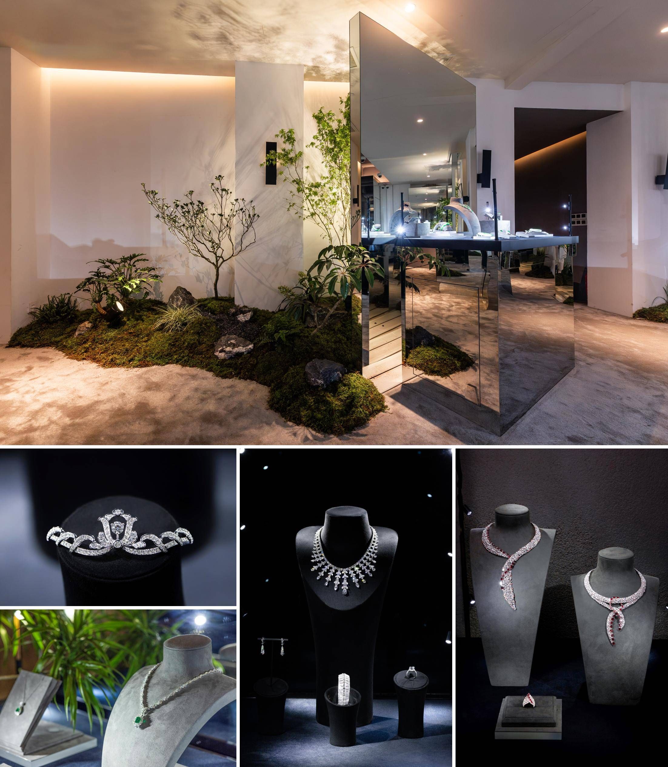 沿著展區(qū)中心的旋轉(zhuǎn)樓梯拾級而上,觀者可從星河流轉(zhuǎn)的世界來到充滿自然氛圍的二樓空間,生機盎然的綠植與別致巧妙的鏡面裝置點綴四周。掩映在這綠色綺境中的,是散發(fā)出煜煜光華的周大福高級珠寶作品。育自天然的鉆石顆顆煥彩,帶著無瑕光澤被巧妙地融入珠寶創(chuàng)作中,共同譜奏出斑斕華美的樂章。
