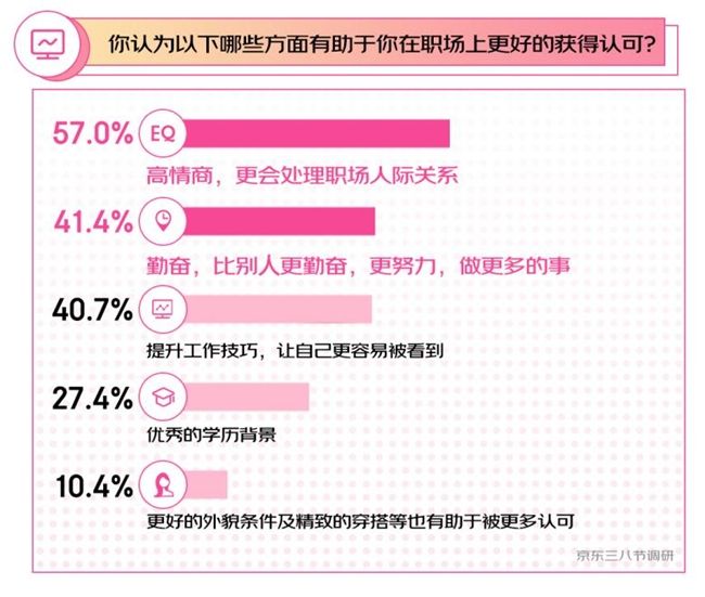 三八婦女節(jié)前夕,京東消費(fèi)及產(chǎn)業(yè)發(fā)展研究院就“2024年flag”的相關(guān)話題向1000名16歲以上的女性進(jìn)行了調(diào)研訪談。調(diào)研顯示,當(dāng)代女性對事業(yè)成功的渴望超過以往,這意味著在職場上要面對和承擔(dān)更大的責(zé)任和壓力。在如何能更好獲得職場上的認(rèn)可方面,更多女性認(rèn)為“高情商”和“更勤奮”更為重要。