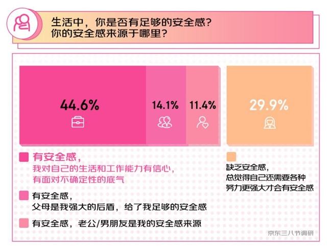在“你的龍年flag,是事業(yè)項(xiàng)還是愛情項(xiàng)?”問題上,87.1%的女性選擇了事業(yè)項(xiàng)。針對“生活中,你是否有足夠的安全感?你的安全感來源于哪里?”的問題,44.6%的女性表示對自己的生活和工作能力有信心,讓自己有面對不確定性的底氣,所以有足夠的安全感。
