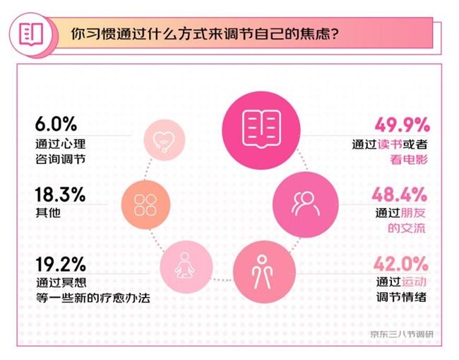 調(diào)研結(jié)果也呼應(yīng)了脫不花的觀點(diǎn),數(shù)據(jù)顯示,受訪的女性更多通過讀書/電影以及運(yùn)動來調(diào)節(jié)自己的焦慮感,在舒緩壓力的同時實(shí)現(xiàn)自我提升。