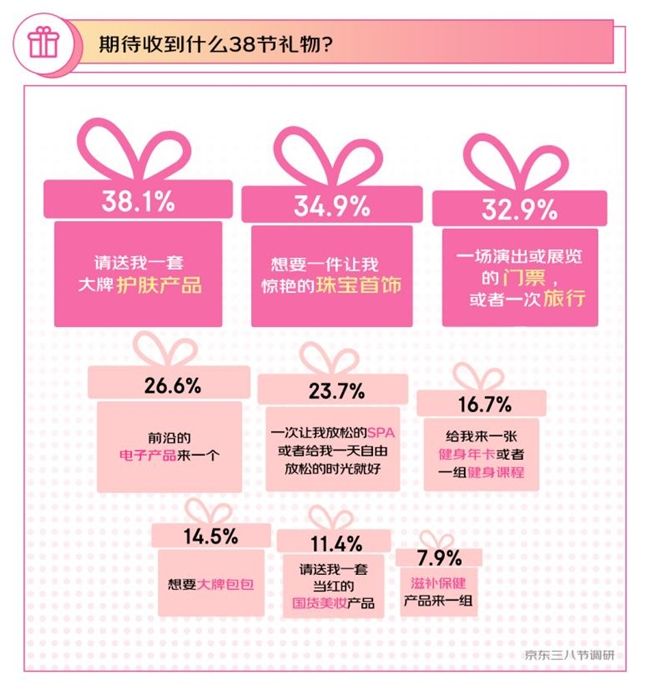 曾經(jīng),婦女節(jié)被稱為“女神節(jié)”“女王節(jié)”。今年的調(diào)研中,更多的女性表示,希望三八婦女節(jié)重新回歸婦女節(jié),正如網(wǎng)友所說:“當(dāng)女性稱呼自己為“婦女”,力量便不假外求”。 更有76%的受訪者表示會在三八婦女節(jié)給自己送禮物,數(shù)據(jù)顯示,護(hù)膚品、珠寶首飾、旅行位居心愿榜TOP3。
