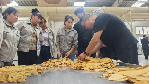 (李云教徒弟和分選工人們學(xué)習煙葉分級 馬梓銘/攝)