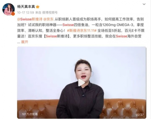為了深入職場(chǎng)年輕人的精神陣地,構(gòu)建高度的圈層認(rèn)同。17日, Swisse斯維詩(shī)誠(chéng)摯邀請(qǐng)金牌經(jīng)紀(jì)人、職場(chǎng)高能量女性——楊天真,化身“Swisse首席加油官”,結(jié)合職場(chǎng)問(wèn)題,通過(guò)微博視頻為粉絲答疑解惑,呼吁職場(chǎng)群體注意健康防患,適當(dāng)補(bǔ)充營(yíng)養(yǎng),做有元?dú)?、有發(fā)量、有腦力、有眼力的“四有職場(chǎng)人”。