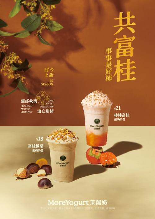 不僅如此,為了讓消費(fèi)者及時(shí)享受到這個(gè)季節(jié)的專屬美味,茉酸奶巧妙融合了桂花、柿子、板栗等時(shí)令食材,推出創(chuàng)新產(chǎn)品。柿柿富桂酸奶奶昔,精選當(dāng)季溏心軟柿,新鮮現(xiàn)剝,與綿密順滑的有機(jī)酸奶搭配,頂部點(diǎn)綴清新桂花,每一口都是金秋的甜蜜與馥郁。富桂板栗酸奶奶昔,采用軟糯香甜的栗子與細(xì)膩綿密的有機(jī)酸奶交融,栗子的綿軟與酸奶的綿密碰撞出醇厚濃郁,再添上馥香桂花,打造出一杯富含秋日氣息的絕佳飲品。
