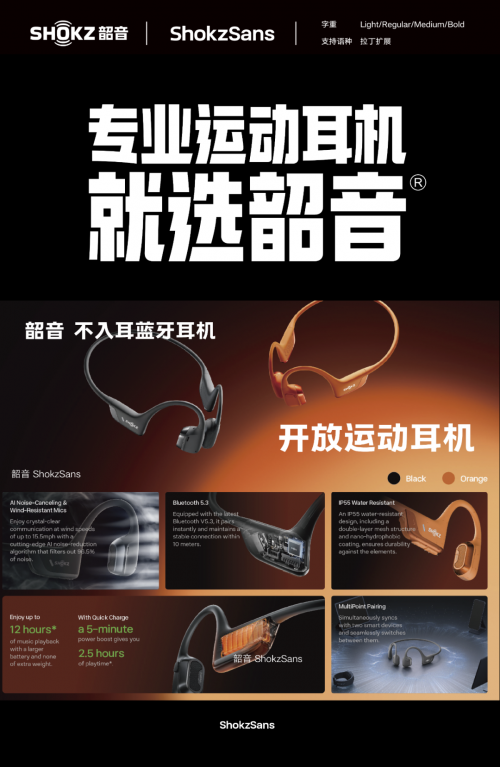 隨著時(shí)代的發(fā)展,品牌形象已成為品牌建設(shè)的重要一環(huán),與之正相關(guān)的品牌字體定制近些年也愈發(fā)火熱,成為強(qiáng)化品牌形象的新趨勢;近日,專業(yè)運(yùn)動(dòng)耳機(jī)品牌Shokz韶音攜手專業(yè)字體定制公司漢儀字庫聯(lián)合推出ShokzSans,并升級中文品牌標(biāo)識(shí)字形,用專業(yè)塑造專業(yè),打造更加一體化的品牌視覺體驗(yàn)。