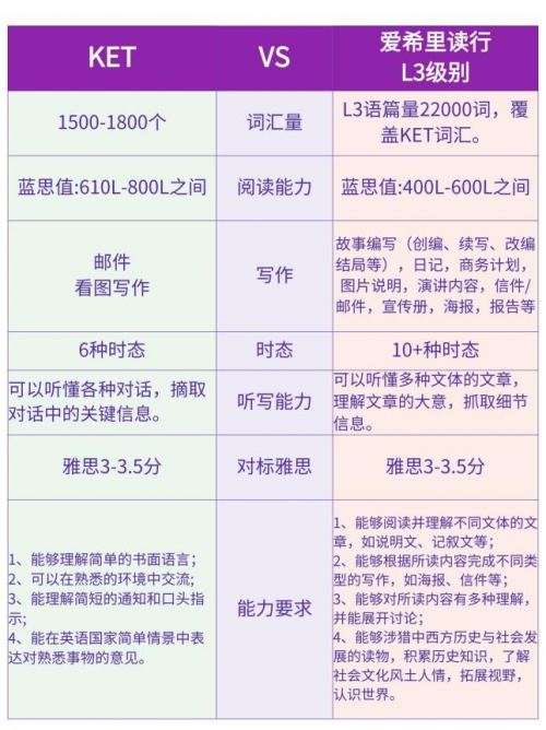 如果在愛(ài)希里讀行原版分級(jí)閱讀營(yíng)完成L3級(jí)別的閱讀后,孩子將會(huì)具備KET所需要的聽(tīng)說(shuō)讀寫(xiě)能力,如下圖: