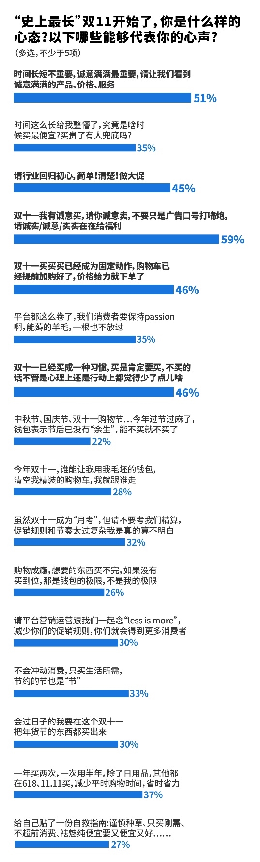 在近4000名消費(fèi)者調(diào)研中,59%的人直言“雙十一我有誠(chéng)意買,請(qǐng)你誠(chéng)意賣,不要只是廣告口號(hào)打嘴炮?!?1%的消費(fèi)者表示“時(shí)間長(zhǎng)短不重要,誠(chéng)意滿滿最重要”,他們希望看到誠(chéng)意滿滿的產(chǎn)品、價(jià)格和服務(wù)。還有45%消費(fèi)者強(qiáng)烈呼吁“請(qǐng)行業(yè)回歸初心,簡(jiǎn)單清楚做大促!”此外,也有消費(fèi)者稱,“雙十一當(dāng)然要充滿passion, 能薅的羊毛一根都不放過”“l(fā)ess is more,減少促銷規(guī)則才會(huì)得到更多消費(fèi)者”。