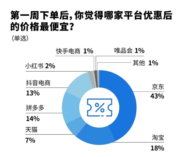 -超五成消費(fèi)者表示在確定心儀產(chǎn)品后會(huì)到各平臺(tái)比價(jià),選擇更便宜的渠道購(gòu)買。第一周下單后,43%的消費(fèi)者認(rèn)為京東優(yōu)惠后的價(jià)格更便宜。