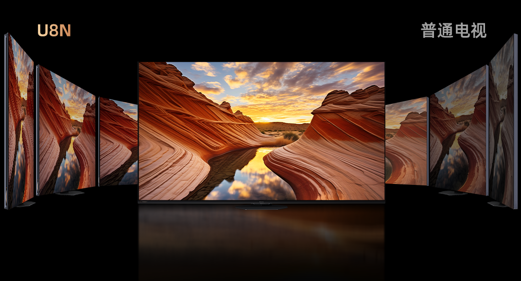 屏幕作為影像的最后一道屏障,一旦受到強(qiáng)光線干擾,往往會(huì)出現(xiàn)反光、閃爍等現(xiàn)象。海信電視U8N因?yàn)榇钶d了定制黑曜屏,采用低反黑色矩陣設(shè)計(jì),將屏幕反射率從行業(yè)5%的平均值降低至2.3%,無(wú)論是早上還是夜晚,屏幕都能感知光線冷暖明暗,自動(dòng)優(yōu)化亮度和色溫,做到深邃黑抗反光,高對(duì)比不浮白;再加上178°超廣對(duì)比度視角,大幅降低了背光雜光溢出問(wèn)題,即使是四世同堂大家庭圍坐觀看,人人在不同角度都能原汁原味體驗(yàn)高品質(zhì)畫面,從此告別拉窗簾看電視的習(xí)慣。