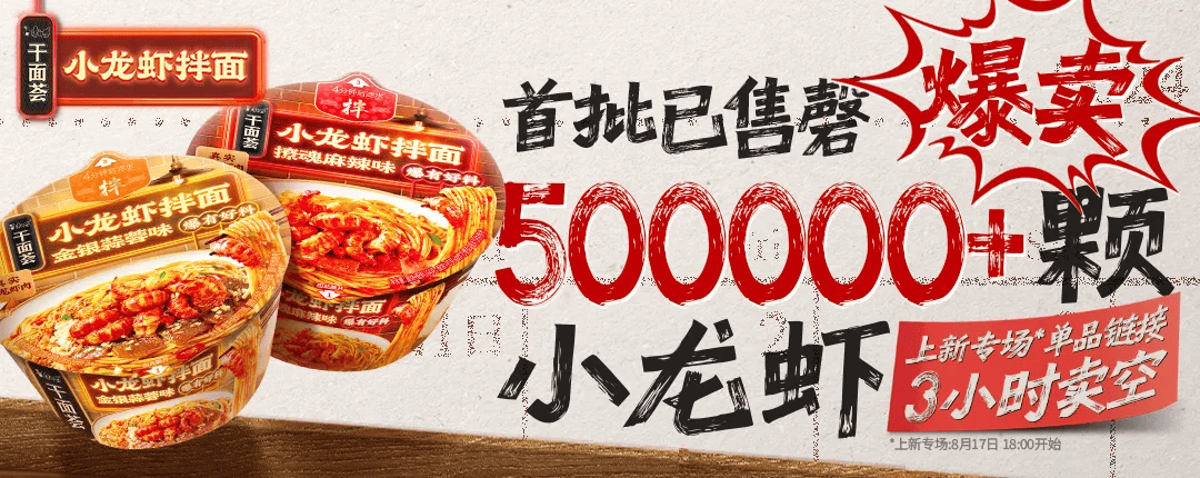據(jù)Morketing的觀察,自8月17日康師傅小龍蝦拌面在抖音電商平臺(tái)首發(fā)以來,就迅速掀起搶購熱潮。消費(fèi)者在抖音、小紅書等社交平臺(tái)上頻頻表示“美味好吃”“真材實(shí)料龍蝦肉”,更是吐槽“銷售太火爆”,甚至感嘆“泡面都得蹲點(diǎn)直播間搶”。第二波上線后再次速速售罄,如今第三波上線,小龍蝦拌面已穩(wěn)居抖音官方旗艦店銷量榜Top 2。