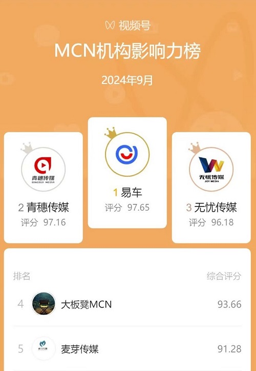 日前,視頻號官方發(fā)布9月“MCN機構(gòu)影響力榜”,知名汽車互聯(lián)網(wǎng)平臺易車旗下短視頻MCN榮登榜首,成為視頻號領域最受關(guān)注的MCN之一。