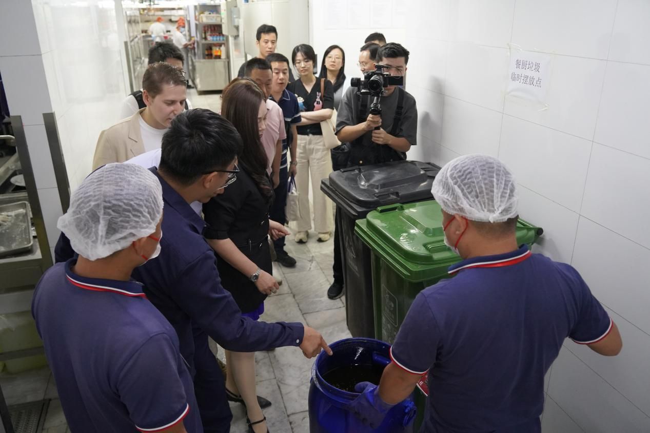 打卡探訪團一行在餐廳后廚觀看廢棄食用油脂稱重、收運過程 攝影 何岺南