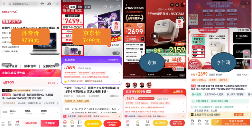 有網(wǎng)友曾曬出同款產(chǎn)品在不同平臺(tái)的價(jià)格對(duì)比,不少產(chǎn)品在京東的價(jià)格確實(shí)要低于其他平臺(tái)一些。比如七彩虹隱星P16筆記本電腦,京東價(jià)比抖音價(jià)便宜了1300元;堅(jiān)果N1 Air高亮版投影儀,京東的券后價(jià)比李佳琦直播間便宜800多。