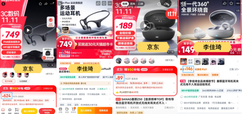 除了筆記本電腦、投影儀,耳機(jī)產(chǎn)品也有此類情況。墨覺Run Plus運(yùn)動(dòng)旗艦款多場(chǎng)景運(yùn)動(dòng)耳機(jī),京東到手價(jià)624元,李佳琦直播間746元,京東又便宜了120多;塞納Z50藍(lán)牙耳機(jī),京東到手價(jià)只要89元,而李佳琦直播間要146元,比京東貴出將近60元。
