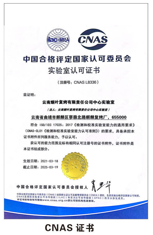 (麒麟復(fù)烤廠CNAS認(rèn)證證書 供圖/趙芯瑜)