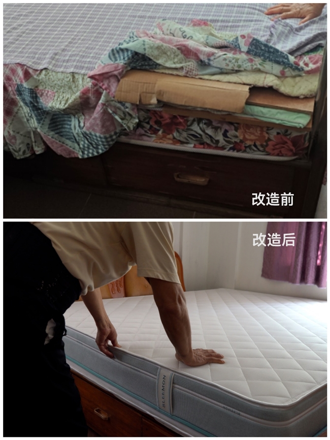 75歲高齡的劉志爽曾是一名退伍老兵,今年6月份被車撞傷后做了腰部手術(shù),如廁時起身困難、洗澡時擔(dān)心滑倒,尤其是舊床墊用了30多年早已塌陷,為了緩解腰傷不得不增加木板和紙皮。京東為其換新的喜臨門乳膠光系列床墊,可以更好地承托腰部,讓老人睡得更舒坦。此外,京東還為老人在衛(wèi)生間增加了美瑞德安全扶手和洗澡椅、大江防滑地墊,并換新了恒潔自動除垢增壓淋浴花灑,如廁、沐浴更加輕松舒適。