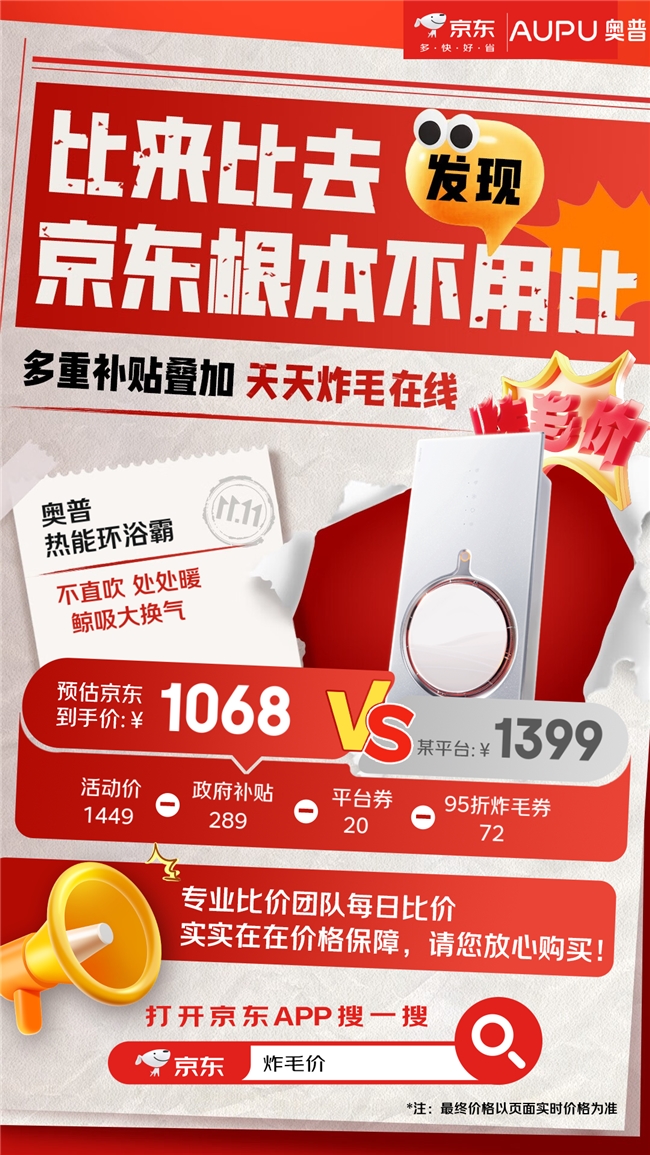 沐浴時,站在奧普熱能環(huán)浴霸下也能享受“貓冬”溫暖,其通過專利環(huán)形熱源,沐浴時形成包裹式暖風(fēng),帶來環(huán)抱式吹風(fēng)體驗。該款產(chǎn)品在政府補(bǔ)貼8折優(yōu)惠的基礎(chǔ)上,使用京東11.11的9.5折炸毛券等消費(fèi)券,到手價為1068元,對比其他平臺1399元的價格,立省331元超劃算。