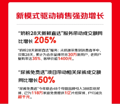 此外,京東超市推出的“尿褲尺碼隨心換”服務(wù),目前已覆蓋京東超市全部尿褲商品,為超3000萬用戶解決尺碼不合適的問題,進一步為家庭育兒降成本。