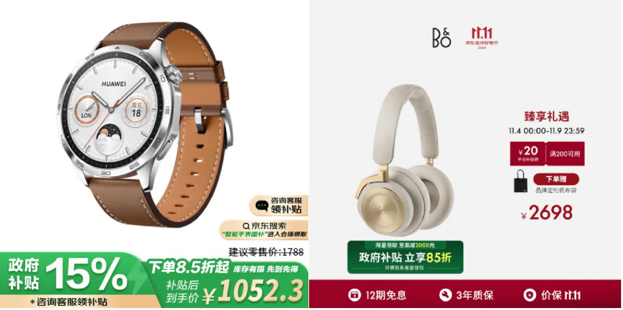 手表、耳機(jī)也能享政府補(bǔ)貼15%,至高補(bǔ)貼2000元。其中,華為WATCH GT4支持活力三環(huán)2.0,支持量身定制運(yùn)動(dòng)目標(biāo),體征監(jiān)測(cè)更精準(zhǔn),還支持藍(lán)牙通話、各類APP、NFC功能,46mm山茶棕京東價(jià)1188元,享滿200減20補(bǔ)貼,再享政府補(bǔ)貼額外立減175.2元,京東11.11到手價(jià)992.8元。B&O Beoplay HX頭戴式藍(lán)牙耳機(jī)支持自適應(yīng)主動(dòng)降噪,支持35小時(shí)續(xù)航升級(jí),符合人體工學(xué)設(shè)計(jì),金色京東原價(jià)2698元,享滿1500減120元和滿1500減75優(yōu)惠券,再享政府補(bǔ)貼額外立減375.45元,京東11.11到手價(jià)2127.55元。