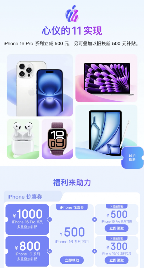 11月9日晚8點(diǎn),京東11.11即將迎來高潮期,壓軸大放價(jià)!11月10日晚8點(diǎn),京東11.11還將開啟“巔峰28小時(shí)”,超多重磅驚喜放送,錯(cuò)過只能等明年!Apple產(chǎn)品也迎來了最佳入手時(shí)機(jī),消費(fèi)者在Apple產(chǎn)品京東自營旗艦店購買iPhone、MacBook、Apple Watch、AirPods等都有專屬優(yōu)惠價(jià)。其中,iPhone 16 Pro系列持續(xù)加補(bǔ)1600元還支持12期免息、iPhone16系列價(jià)保至11.11、Mac新品立享20%政府補(bǔ)貼,至高立減2000元,感興趣的果粉,現(xiàn)在打開京東APP搜索“蘋果大額券”即可直達(dá)活動(dòng)會(huì)場(chǎng)。