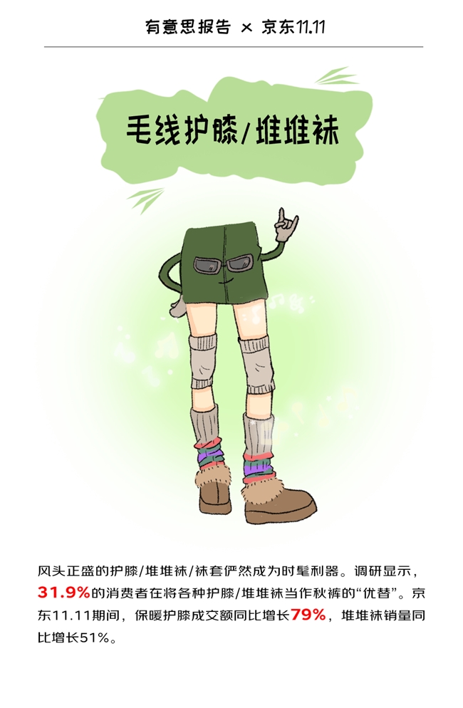 今年,護(hù)膝/堆堆襪有望成為新晉保暖單品。調(diào)研顯示,31.9%的消費(fèi)者在將各種護(hù)膝/堆堆襪當(dāng)作秋褲的“優(yōu)替”。 京東11.11期間,保暖護(hù)膝成交額同比增長79%,堆堆襪銷量同比增長51%。不管是軟糯的毛線護(hù)膝、隱形又貼心的硅膠護(hù)膝,還是保暖不臃腫的堆堆襪,簡直是腿部膝蓋的“私人定制”,哪里需要暖哪里。